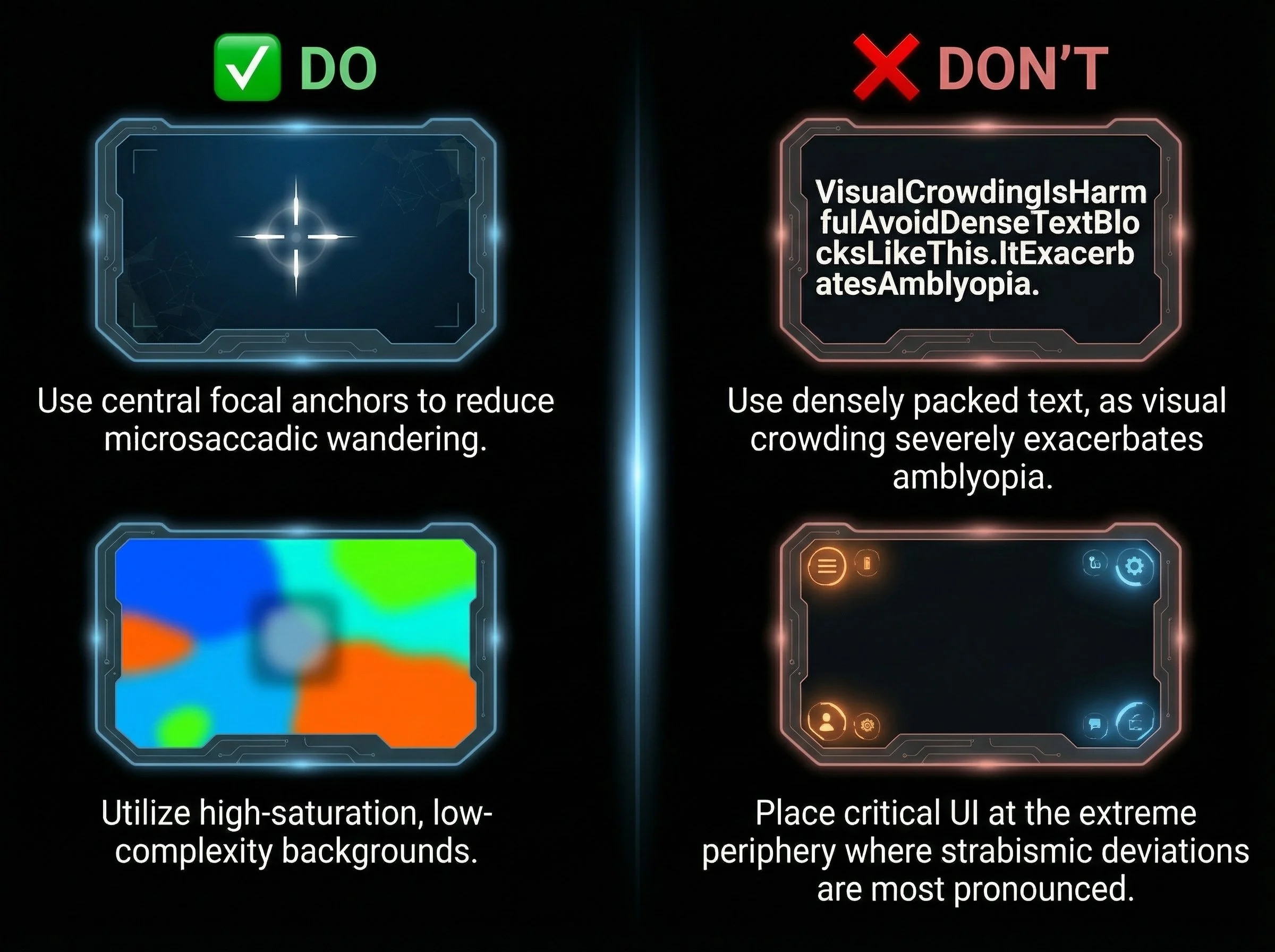 Smart spatial layout actively limits visual suppression and keeps the user’s fovea engaged exactly where therapeutic value is highest