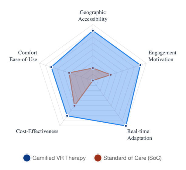 The radar chart (below) visualizes the stark contrast in user-centered metrics between traditional clinical visits and an adaptive, gamified VR therapy approach