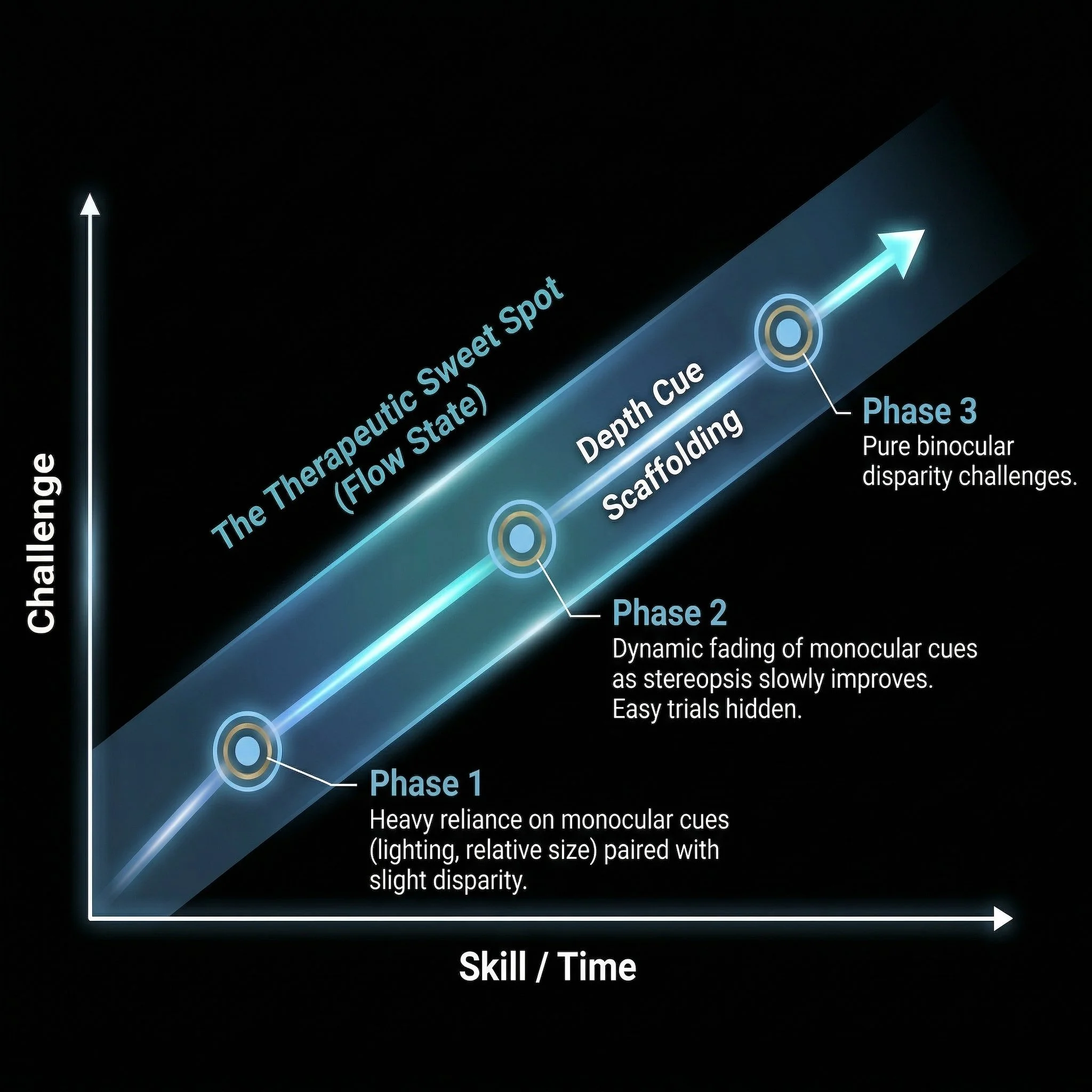 Dynamic scaffolding keeps the patient perfectly balanced to prevent cognitive overload and visual fatigue