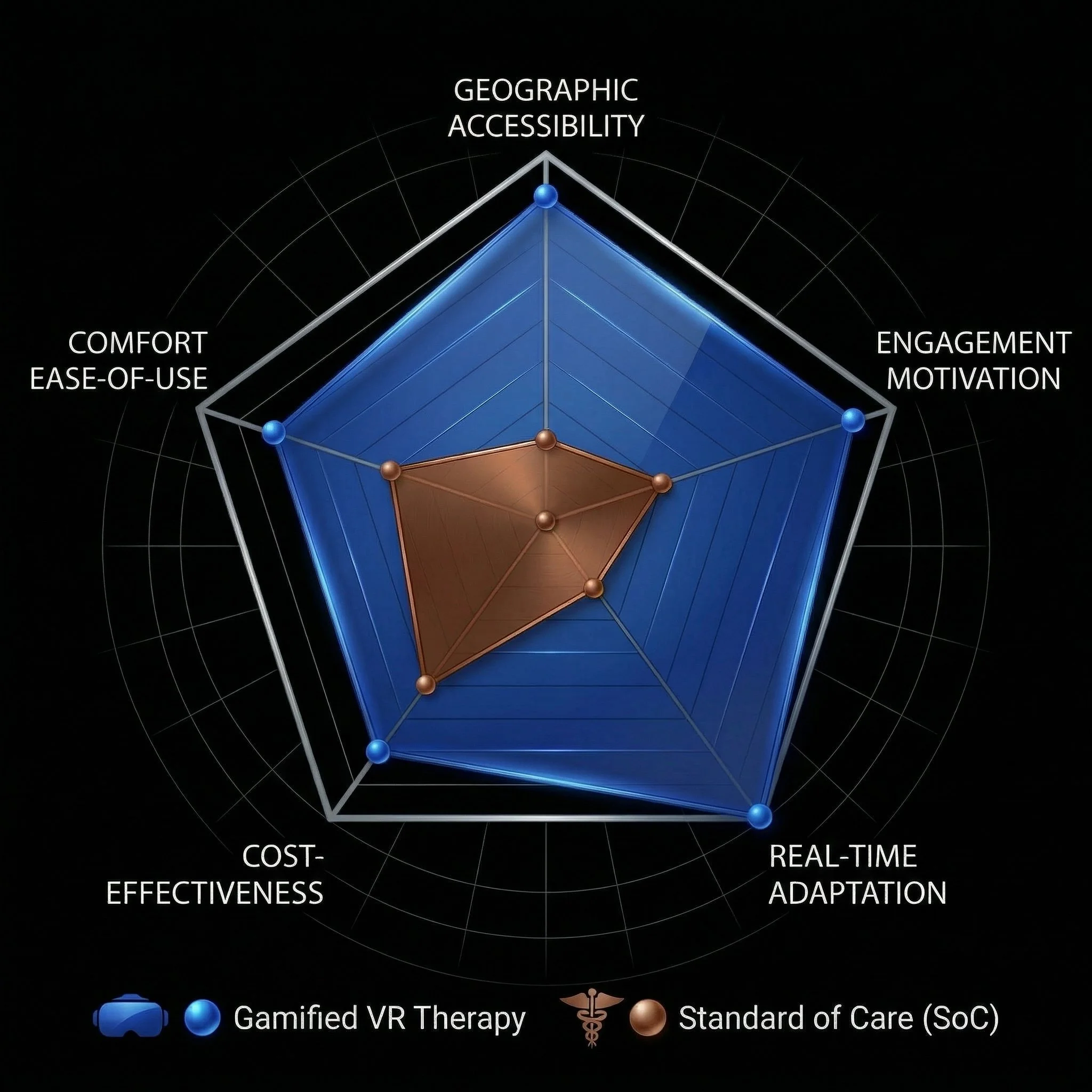 The radar chart (below) visualizes the stark contrast in user metrics between traditional clinical visits and an adaptive, gamified VR therapy approach