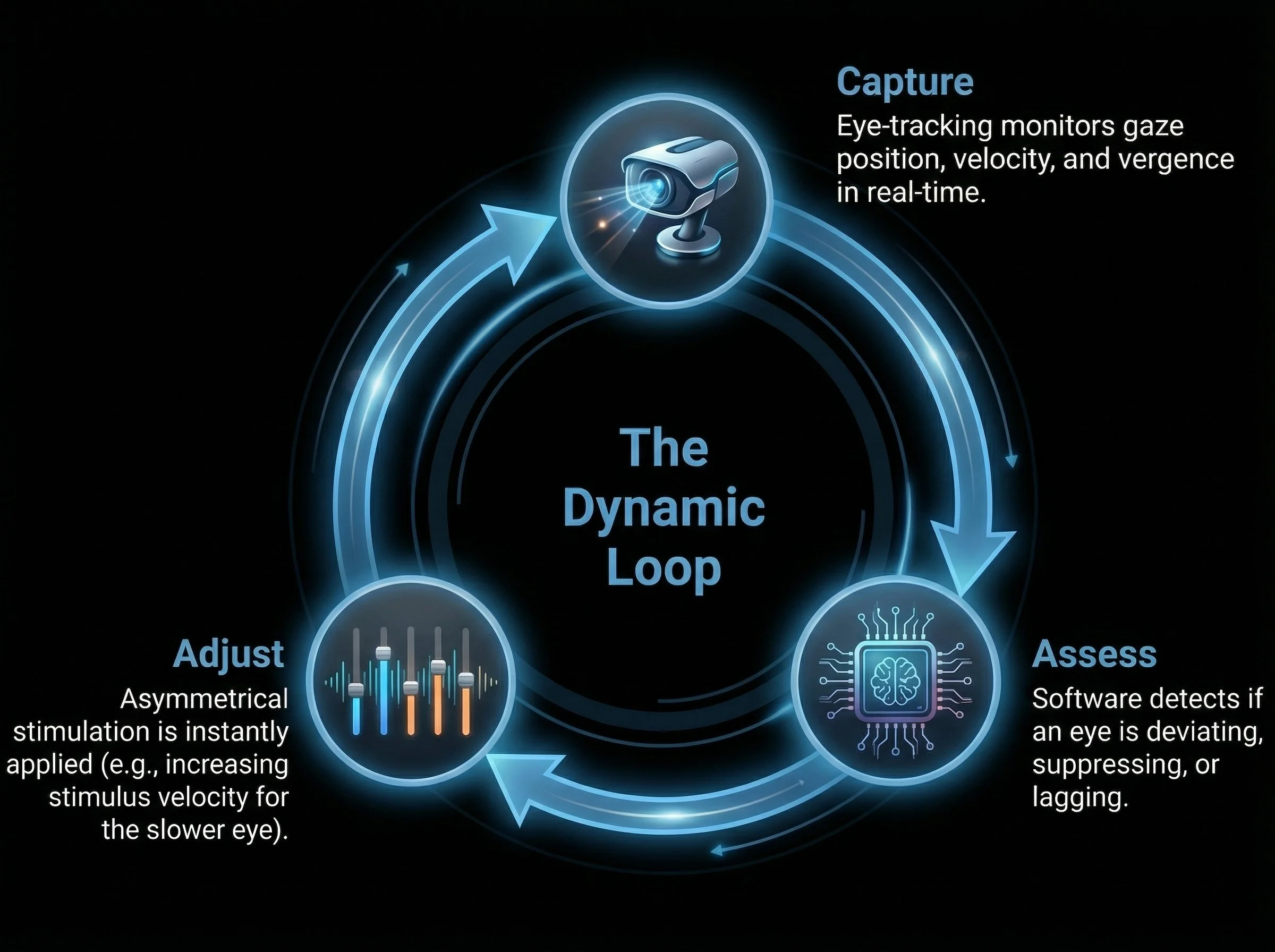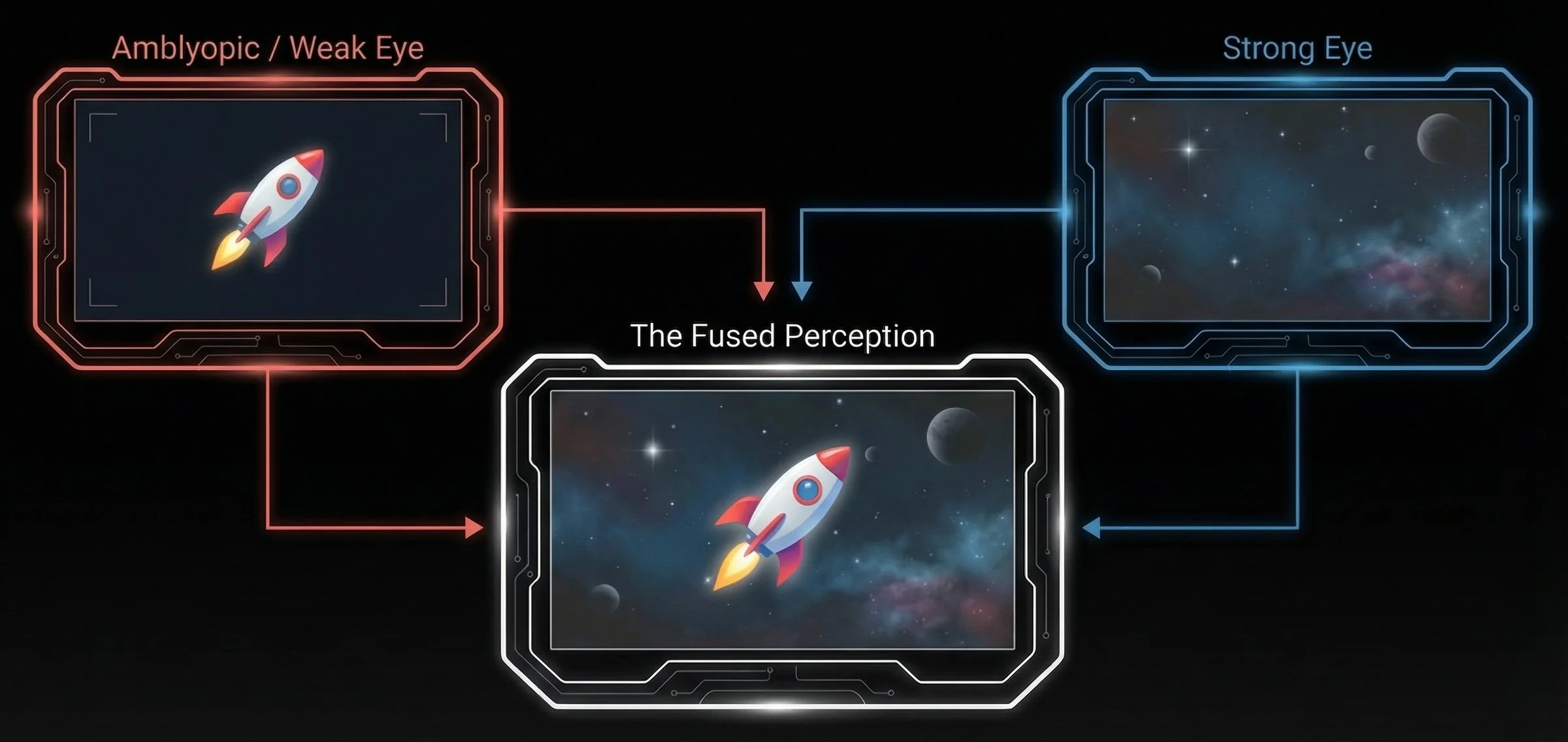 By reducing contrast in the strong eye and placing critical objectives in the weak eye, the software achieves what a physical eye patch attempts, but does so while preserving and actively training binocular fusion