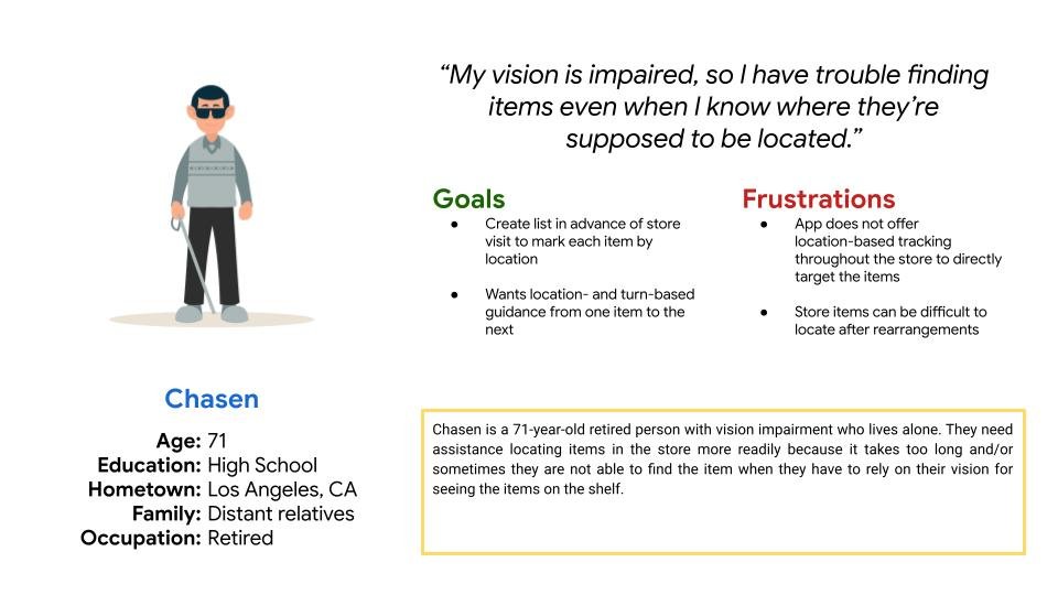 Chasen is a 71-year-old retired person who lives alone with vision impairment who needs assistance from an app to locate items in the store more readily because it takes too long and/or sometimes they are not able to find the item when they have to rely on their vision for seeing the items on the shelf.